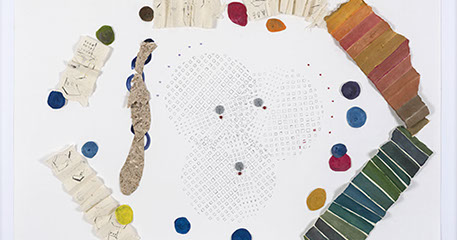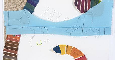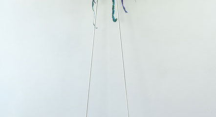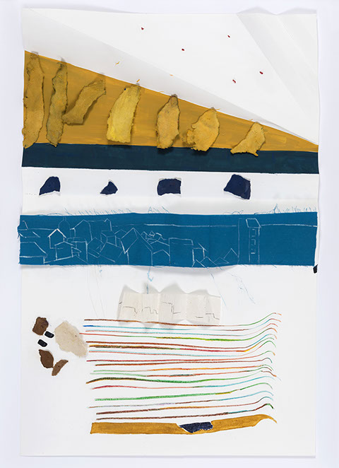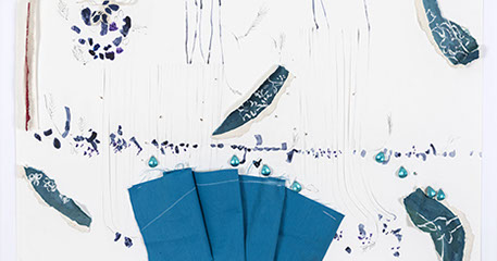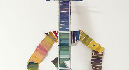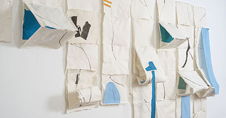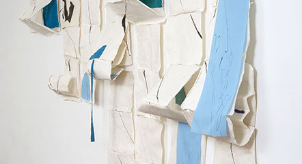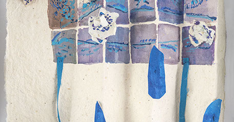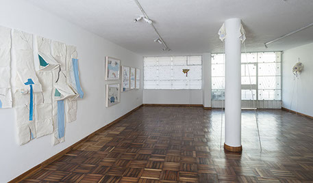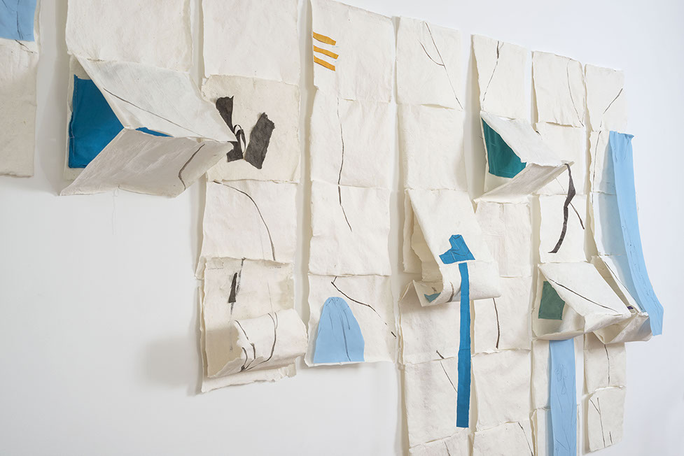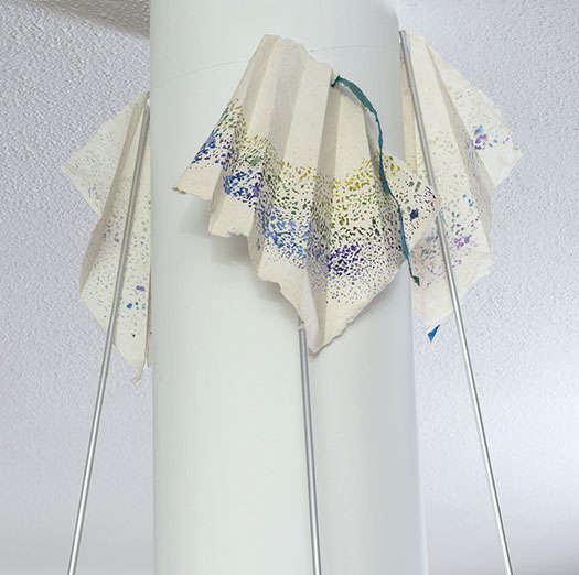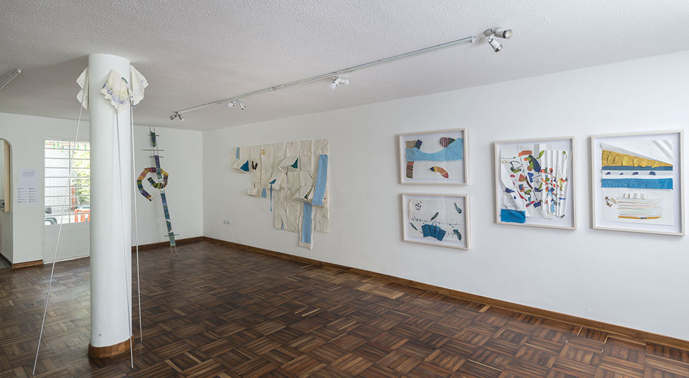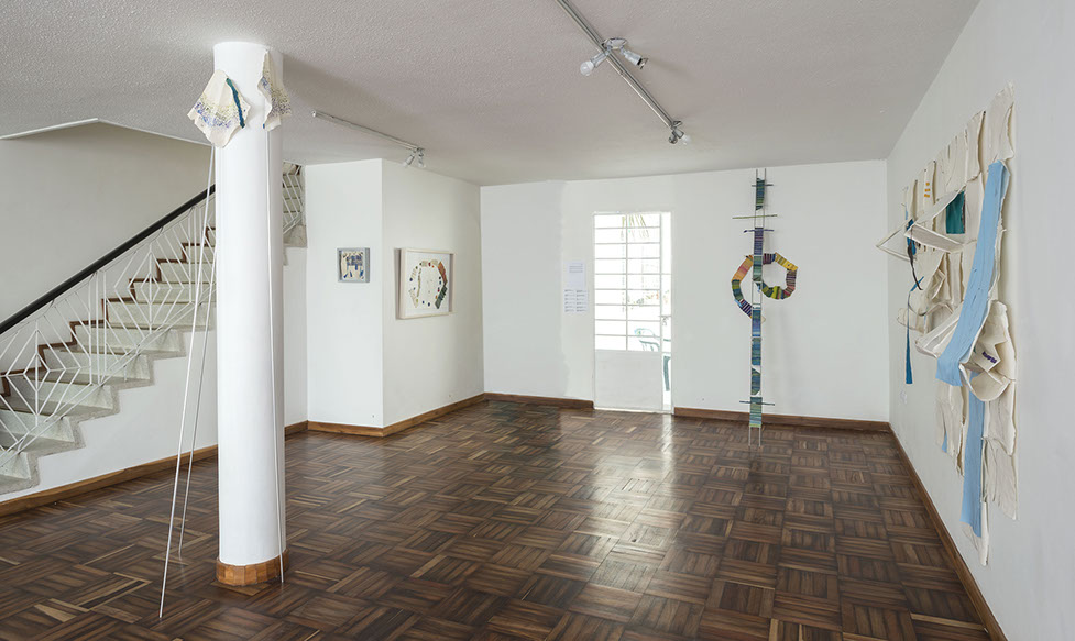 María Fernanda Zuluaga transforma las escaleras en pliegues y abanicos. La exposición Jacaranda está compuesta por obras en su mayoría elaboradas en acuarela a veces haciendo collage sobre papel de fique previamente moldeado como objeto creado.